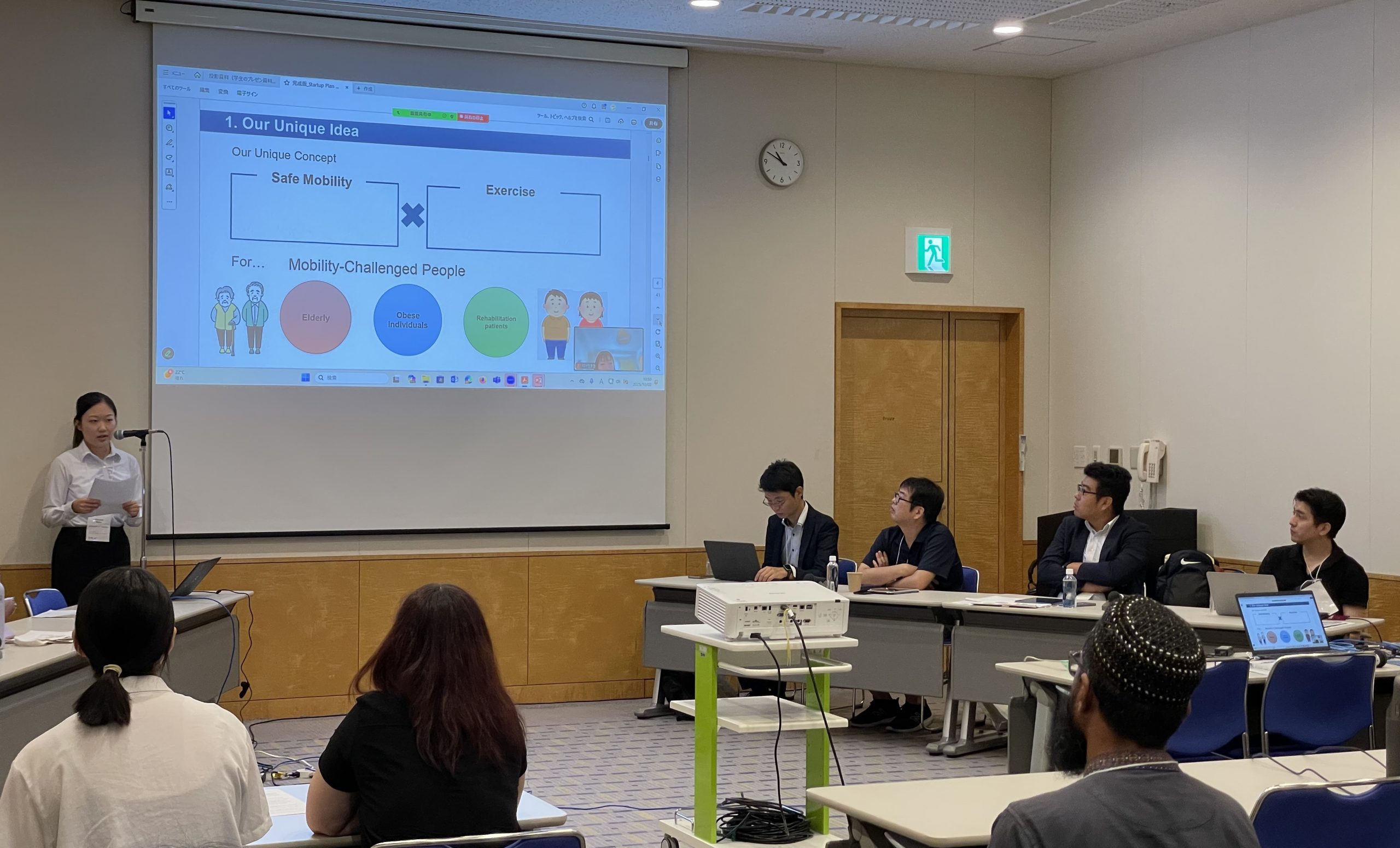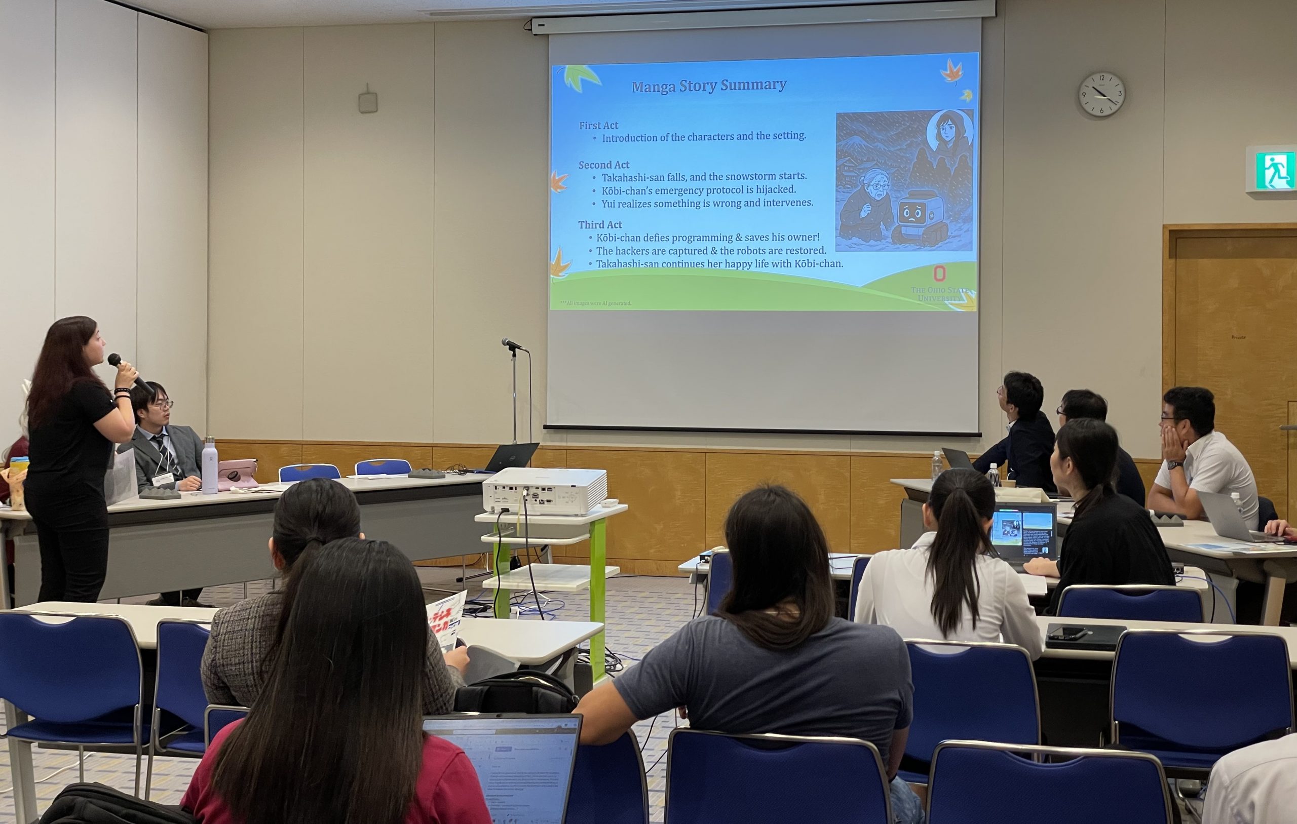学生によるプレゼンテーションは全部で3本。1本目は森尾先生主催のISSマンガコンテストで優勝したOSUのAdrijanaさん、続く2本はISS-PBLコースの優秀グループによるビジネス提案のブラッシュアップ版です。